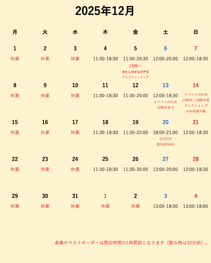 2025年12月の営業カレンダー 2025.12.042025.11.29 *12月4日更新版・5日は20時半まで営業・13日はおしゃべり会のため16時半までの営業・14日はイベントのため休業(17半〜18時半までブックショップ利用可能)・19日は22時まで営業・20日はパーティーのみの営業・29日から翌月2日まで冬季休業